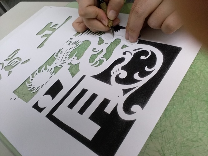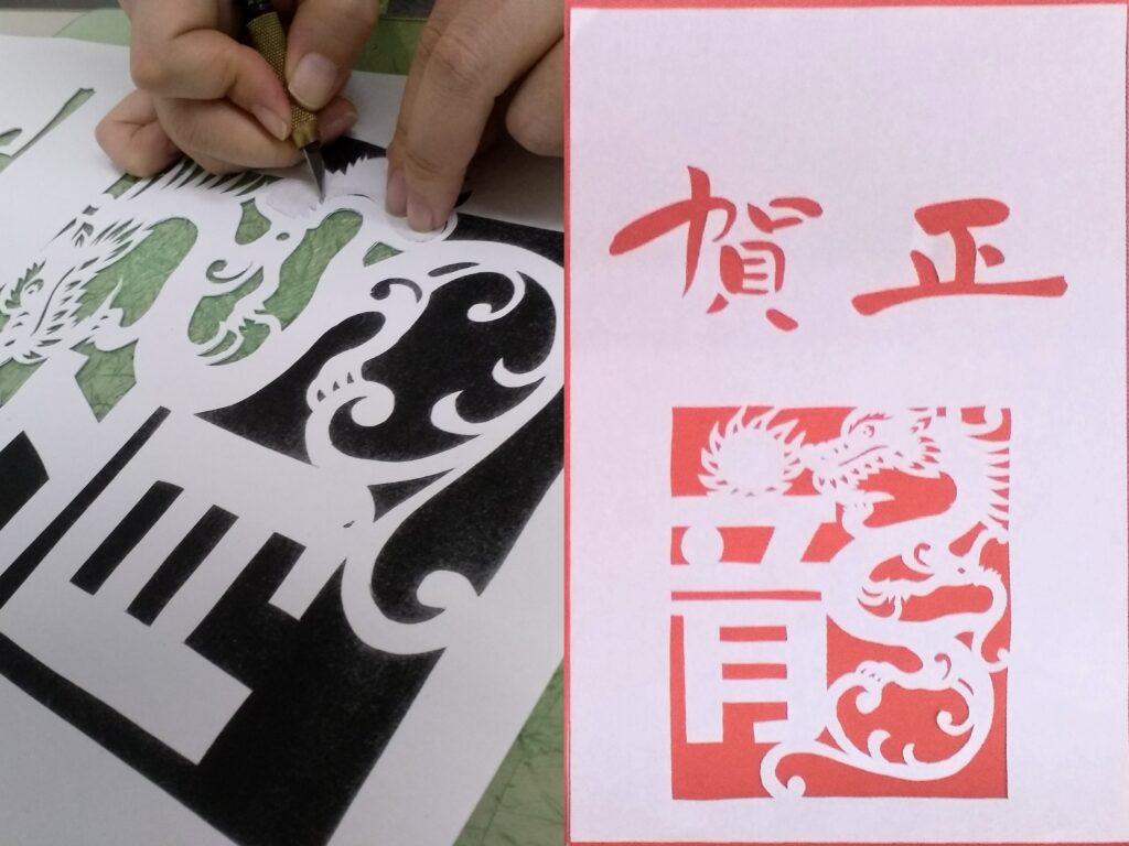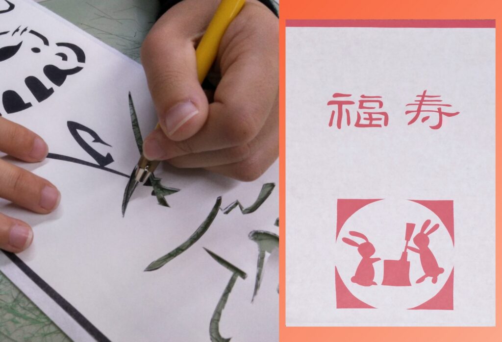 デザインカッターを使って干支などが描かれた型紙を切り抜き、新年を祝う「はかま紙」を作ります。来年の干支はうまです!