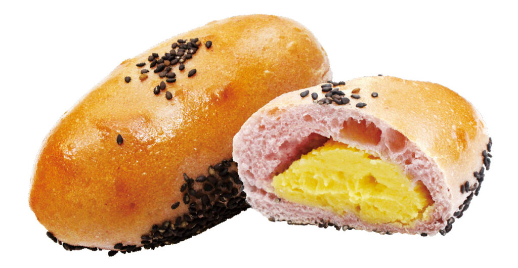 秋の定番のぽてっとした焼き芋みたいなパンが絶品!紫いも色の生地にゴマがたっぷり。おいも好き必食です。