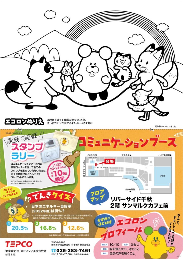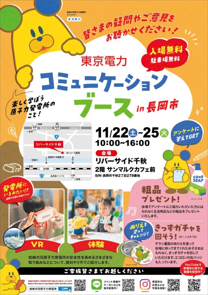 柏崎刈羽原子力発電所の安全性を高める取り組みなどについて、資料やVRで紹介する『東京電力 コミュニケーションブース in長岡市』。お子さんもワクワクしながら楽しめるコーナーがたくさん! 「リバーサイド千秋」内で開催なので、お買い物がてら家族みんなで行ってみよう。