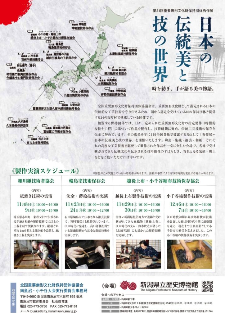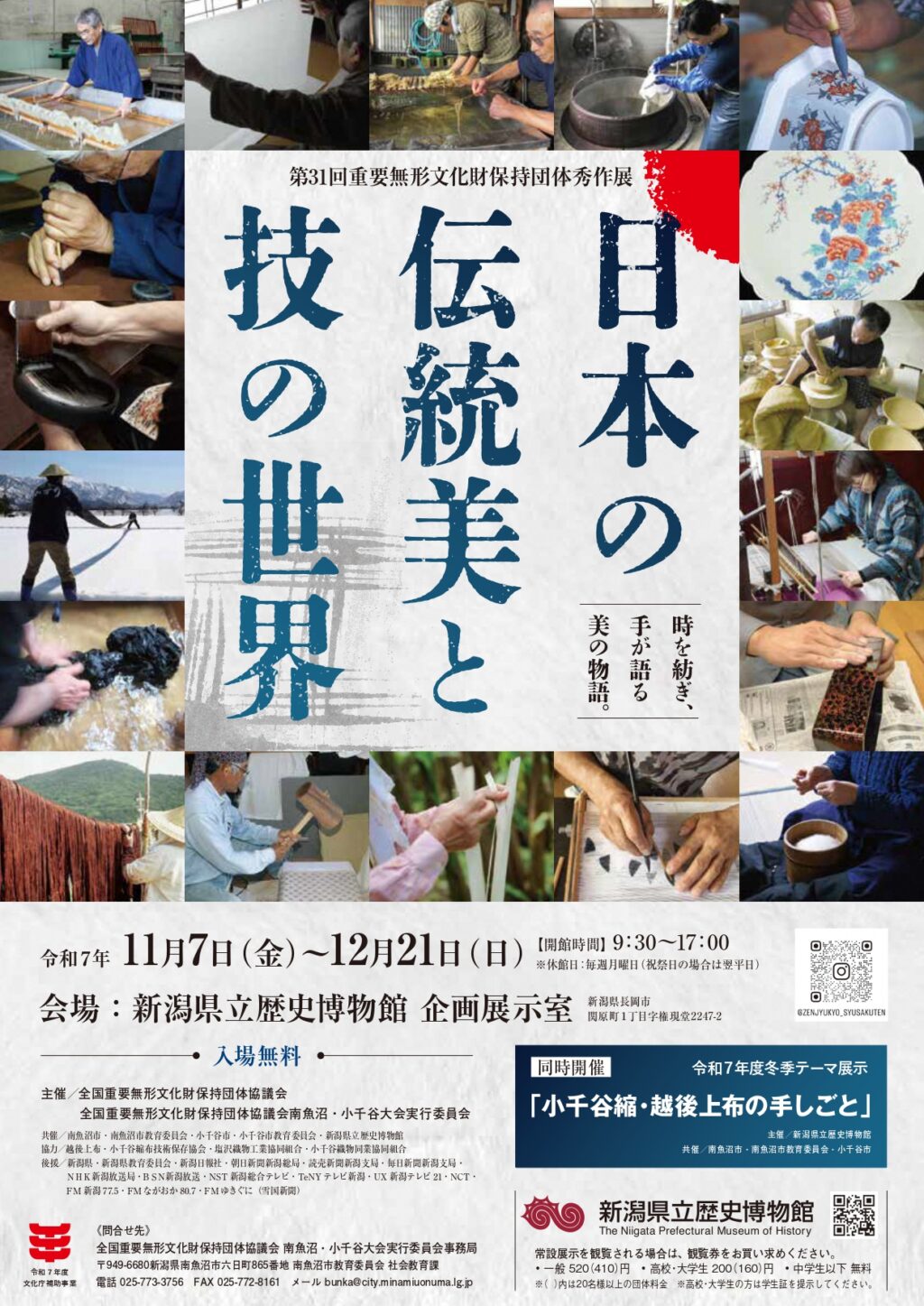 重要無形文化財に指定されている全国の伝統工芸技術の傑作を展示。あわせて新潟県内の重要無形文化財を紹介する展示も設けられます。